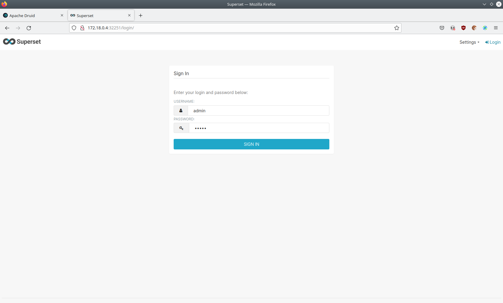 Open the superset endpoint external-superset in your browser (http://172.18.0.4:32251 in this case).